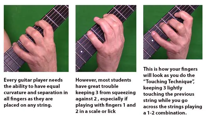One student put it this way: “The “All aboard” concept (placing all fingers on the 6th string with equal curvature and spacing of all fingers) is moving along but for the life of me I can’t seem to get a space between my 2nd and 3rd finger. They bunch up continuously (and I do feel I am relaxed). Will this separation happen naturally as muscles progress? This happens at the 7th fret...so I tried the 10th, same deal.”